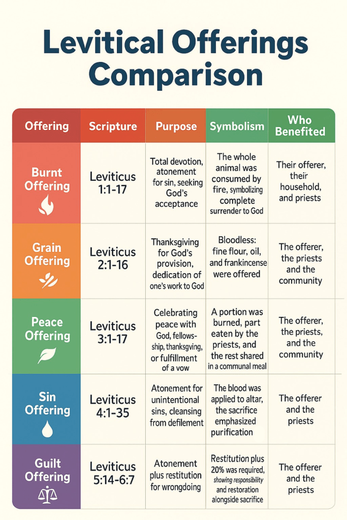 While we no longer bring animals, grain, or restitution offerings, the five offerings point directly to Christ and to how we live out our faith. Here’s the correlation: